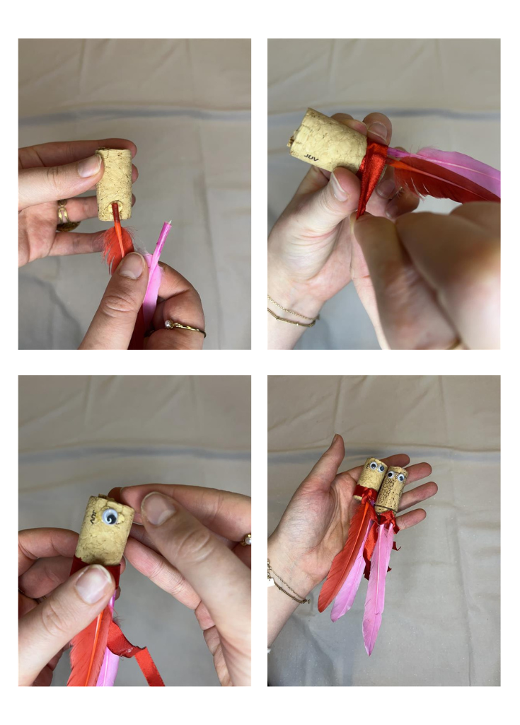 1. Neem een kurk en versier deze met lintjes, touwtjes, pluimpjes of papiersliertjes.