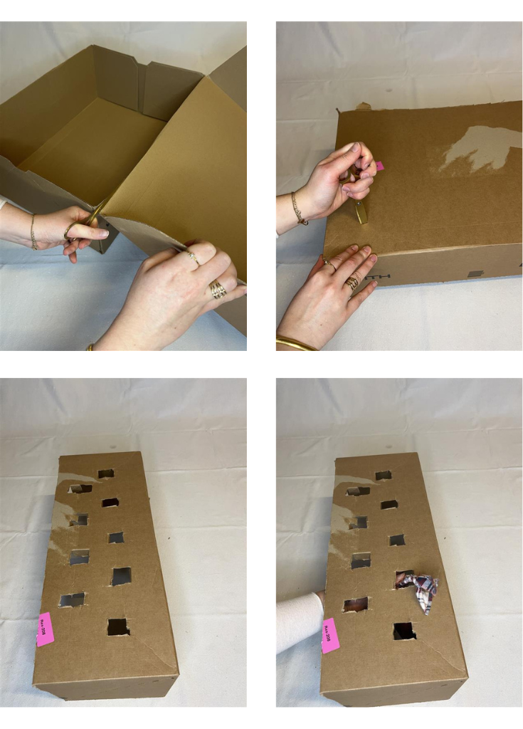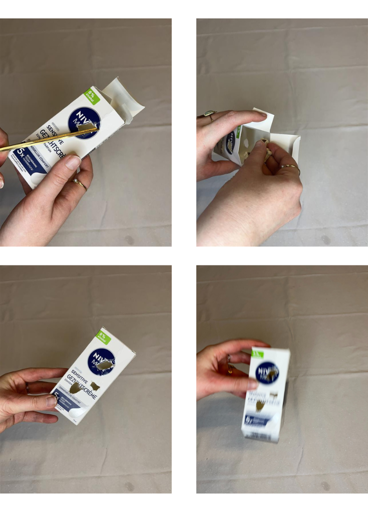 1. Neem een doos en knip één zijkant eruit, zodat je een soort ‘tafeltje’ krijgt.